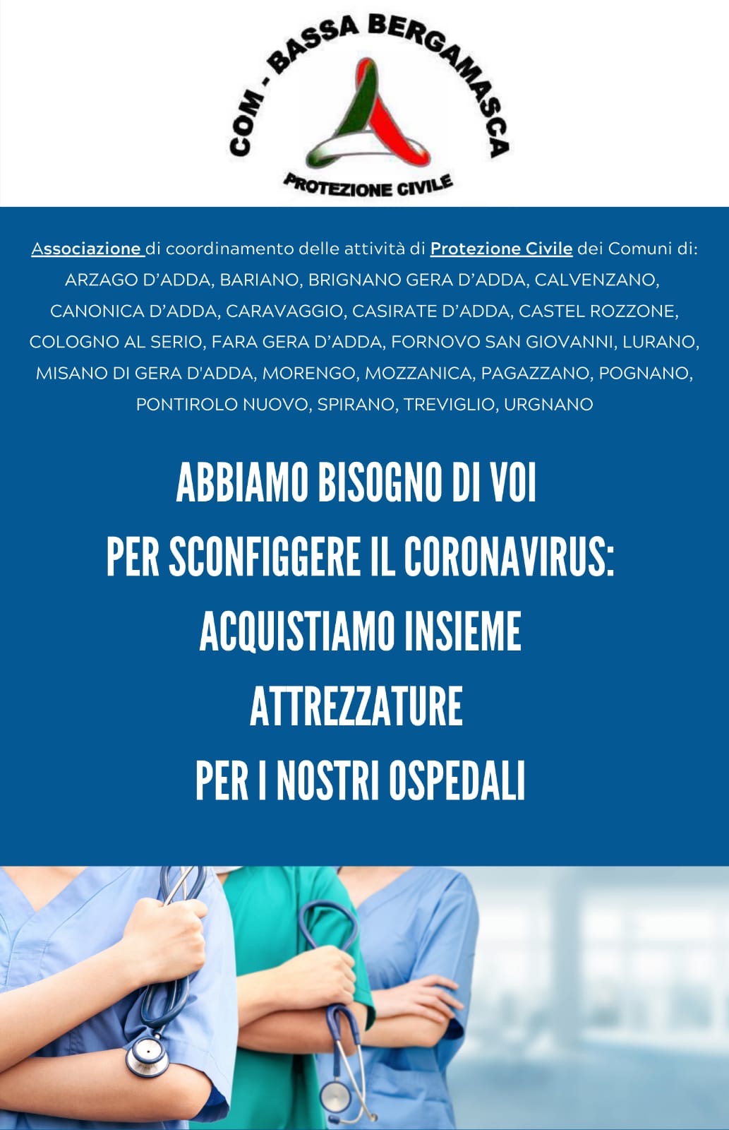 Dopo la raccolta fondi per il terremoto del centro Italia, stavolta le amministrazioni locali lanciano un appello per supportare gli ospedali di Treviglio-Caravaggio e Romano di Lombardia in questa fase di emergenza, promuovendo una nuova raccolta fondi per l’acquisto di attrezzature da donare all’Asst Bergamo Ovest.