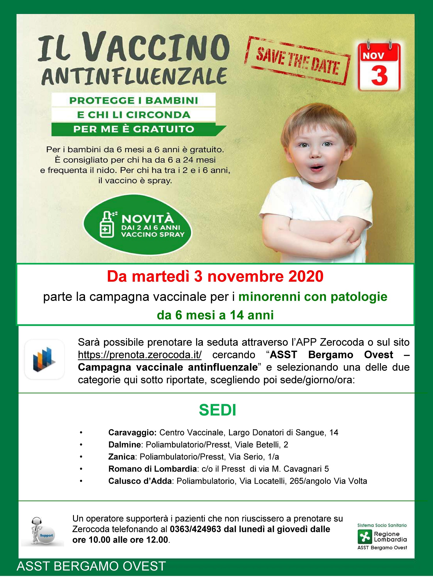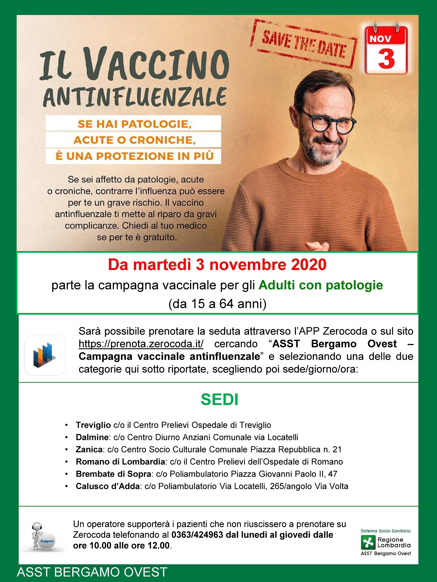 Quest’anno per effettuare le vaccinazioni nel rispetto delle norme di sicurezza anti COVID, l’accesso alle strutture vaccinali avverrà esclusivamente su appuntamento attraverso la prenotazione sull’APP Zerocoda o al sito https://prenota.zerocoda.it/ cercando “Vaccinazioni ASST Bergamo Ovest” e selezionando la sede più prossima alla vostra residenza (residenza che deve essere in uno dei 76 paesi dell’ASST Bergamo Ovest).
