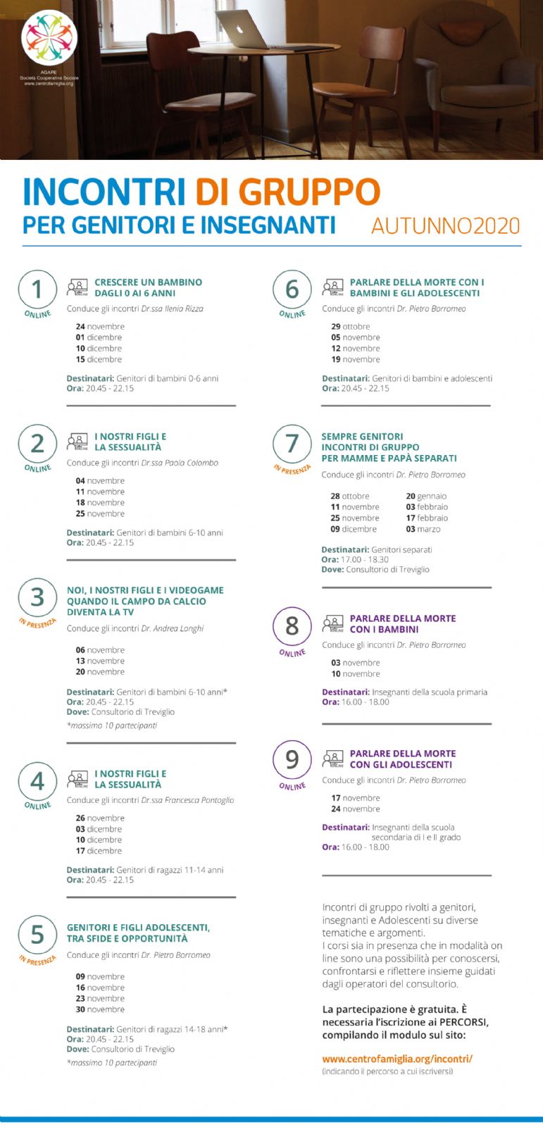 Incontri di gruppi per genitori, insegnanti e adolescenti su diverse tematiche e argomenti.