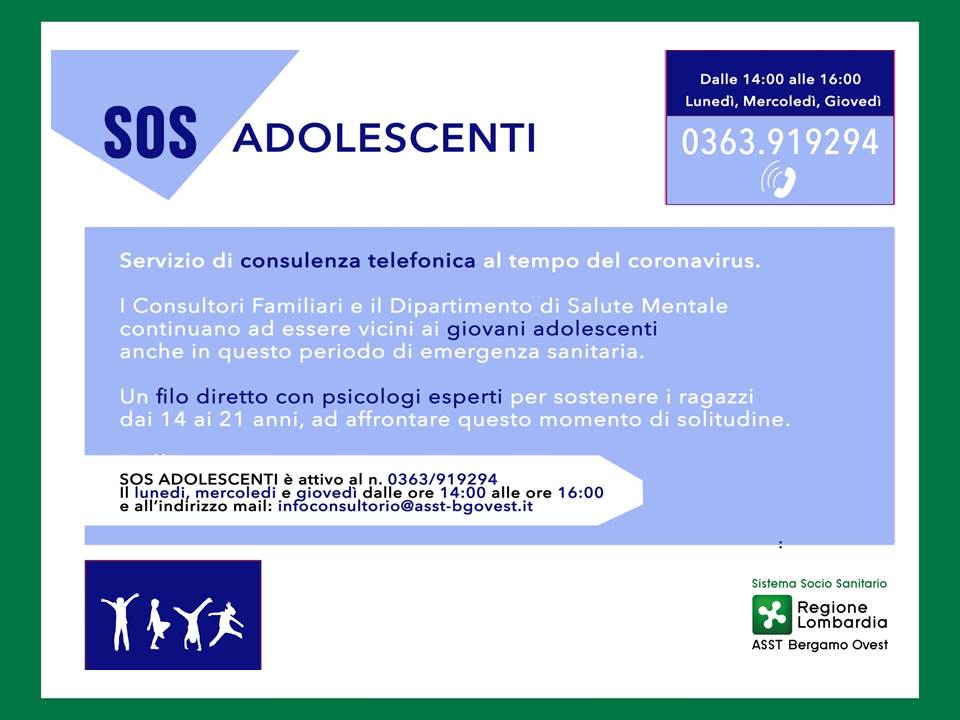 Il Dipartimento Rete Integrata Materno Infantile (RIMI) ed i Consultori dell’ASST Bergamo Ovest, per rispondere alle esigenze dei nostri giovani in questo nuovo lockdown, delle neo mamme e dei genitori, ha istituito tre servizi di consulenza telefonica, SOS MAMME - SOS GENITORI - SOS ADOLESCENTI.