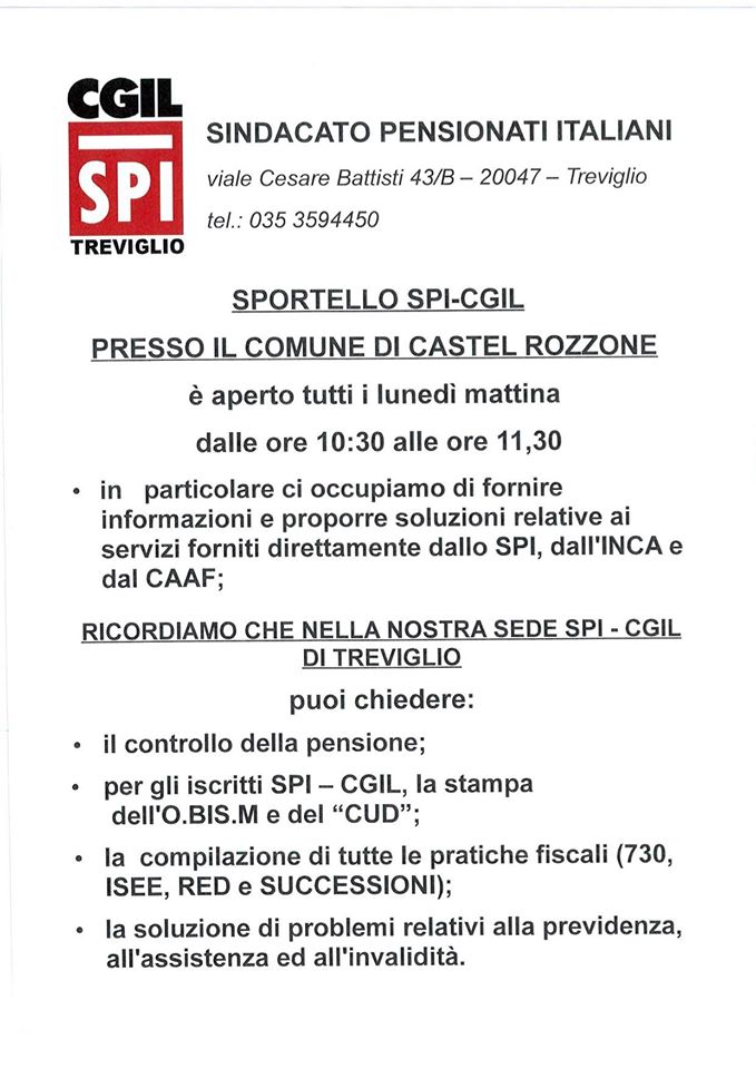 Sportello SPI CGIL – TUTTI I LUNEDì DALLE ORE 10.30 ALLE ORE 11.30