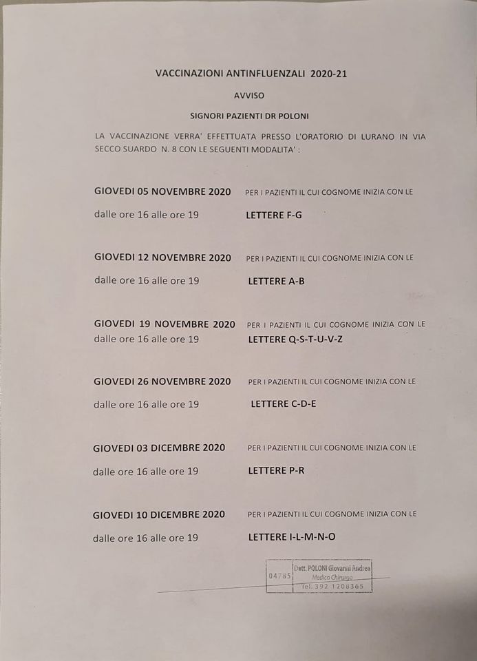 La vaccinazione verrà effettuata presso l'oratorio di Lurano in via Secco Suardo 8, secondo le modalità descritte in Allegato