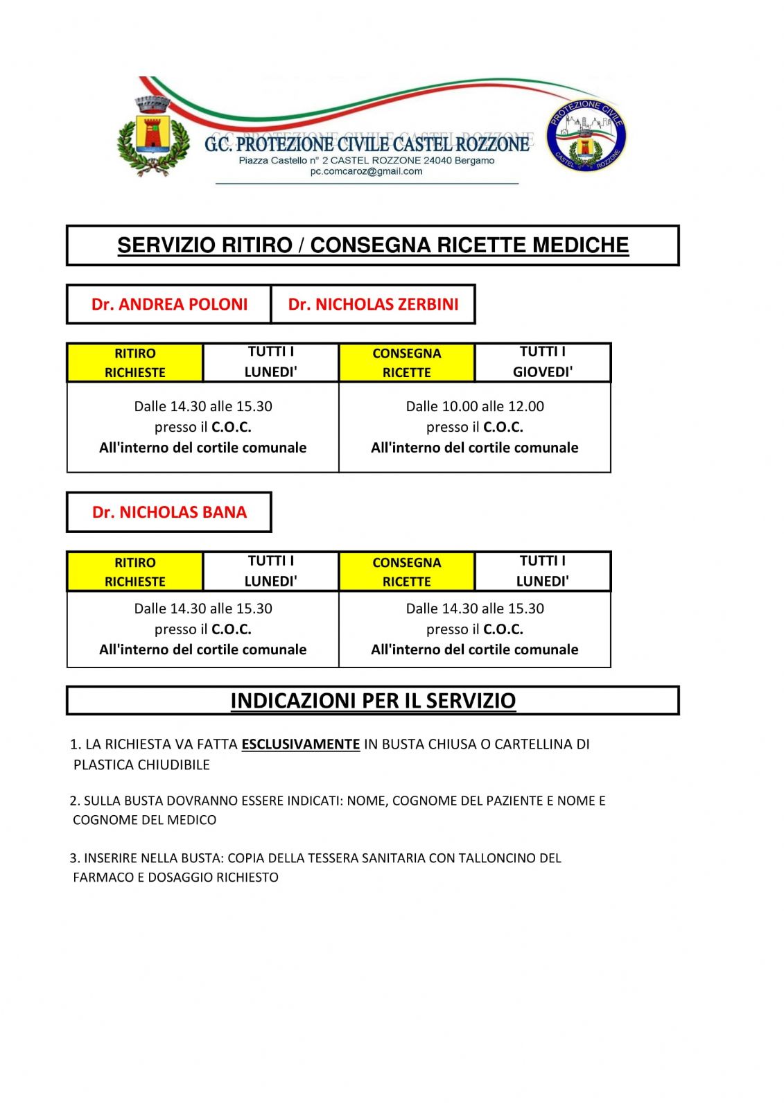 Consegne Ricette: I Lunedì dalle 14.30 alle 15.30