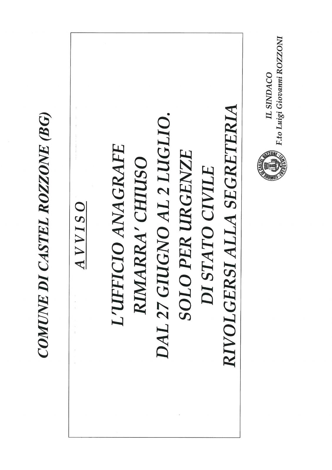 solo per urgenze di stato civile rivolgersi alla segreteria