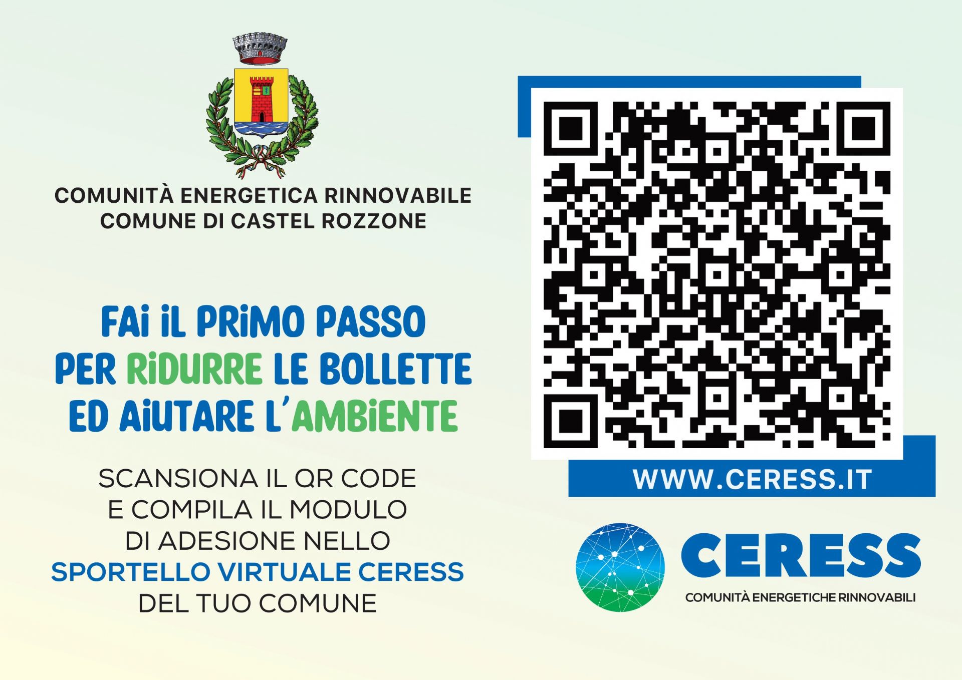 Da oggi è possibile aderire alla Comunità Energetica Rinnovabile (CER) di Castel Rozzone utilizzando il QR code che consente di accedere direttamente allo sportello virtuale Ceress del Comune.
