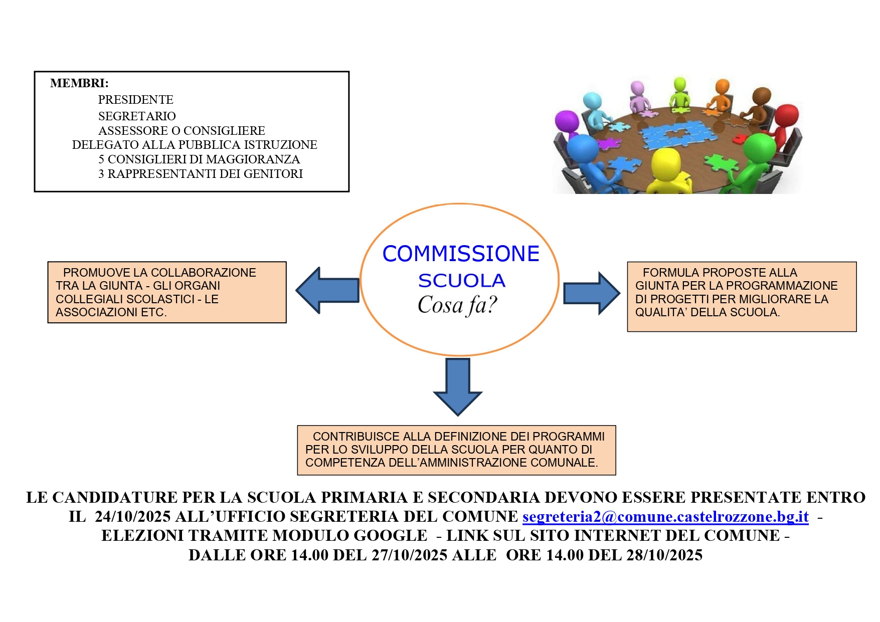 Le candidature per la scuola primaria e secondaria devono essere presentate entro il 24/10/2025 all’ufficio segreteria del comune segreteria2@comune.castelrozzone.bg.it - elezioni tramite modulo google - link in basso - dalle ore 14.00 del 27/10/2025 alle ore 14.00 del 28/10/2025