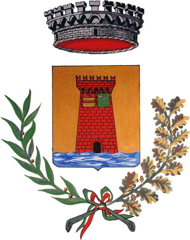 Sfondo d’oro con torrione rosso murato di nero e merlato di 6 alla ghibellina. Sotto la merlatura due stemmi: a destra uno d’oro con fascia rossa, a sinistra uno verde con il biscione visconteo azzurro. Il torrione si erge su una riviera mareggiata azzurra.