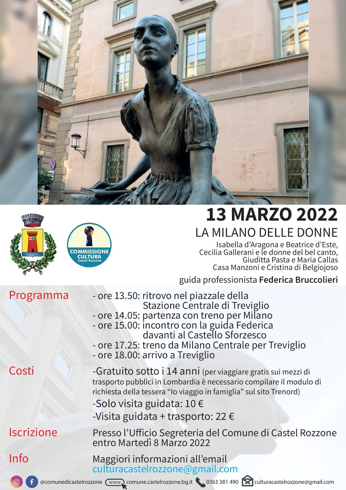 a Commissione Cultura di Castel Rozzone vuole celebrare tutte le donne in occasione della Giornata Internazionale dei Diritti della donna (8 marzo) con una visita guidata a Milano, domenica 13 marzo, che ci condurrà alla scoperta di alcune meravigliose, potenti, raffinate donne che hanno a loro modo fatto la storia della città.
