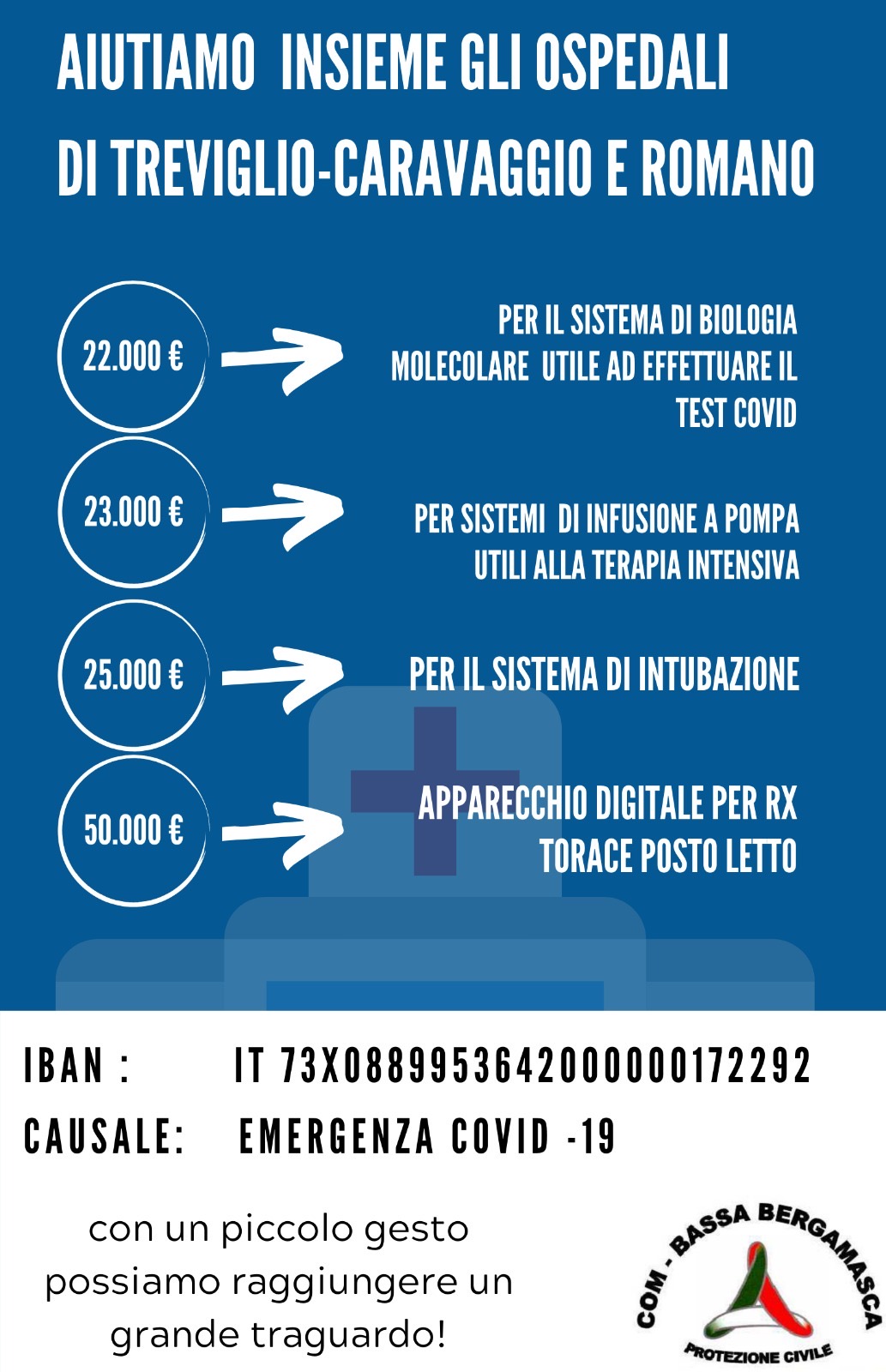 In particolare l’obiettivo è quello di poter acquistare sistemi per infondere i farmaci in terapia intensiva, strumenti per l’intubazione difficile, un apparecchio digitale per effettuare radiografie del torace direttamente nel letto d’ospedale e un sistema di biologia molecolare utile ad effettuare il test di positività al Covid-19. Per garantire questa strumentazione servono almeno 120.000 euro, obiettivo che i Sindaci contano di raggiungere a breve, grazie anche ad una prima promessa di donazione di Fiorenzo Erri, imprenditore trevigliese che ha di fatto avviato la raccolta annunciando di voler devolvere 50.000 euro.