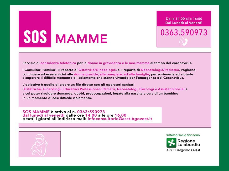 Il Dipartimento Rete Integrata Materno Infantile (RIMI) ed i Consultori dell’ASST Bergamo Ovest, per rispondere alle esigenze dei nostri giovani in questo nuovo lockdown, delle neo mamme e dei genitori, ha istituito tre servizi di consulenza telefonica, SOS MAMME - SOS GENITORI - SOS ADOLESCENTI.