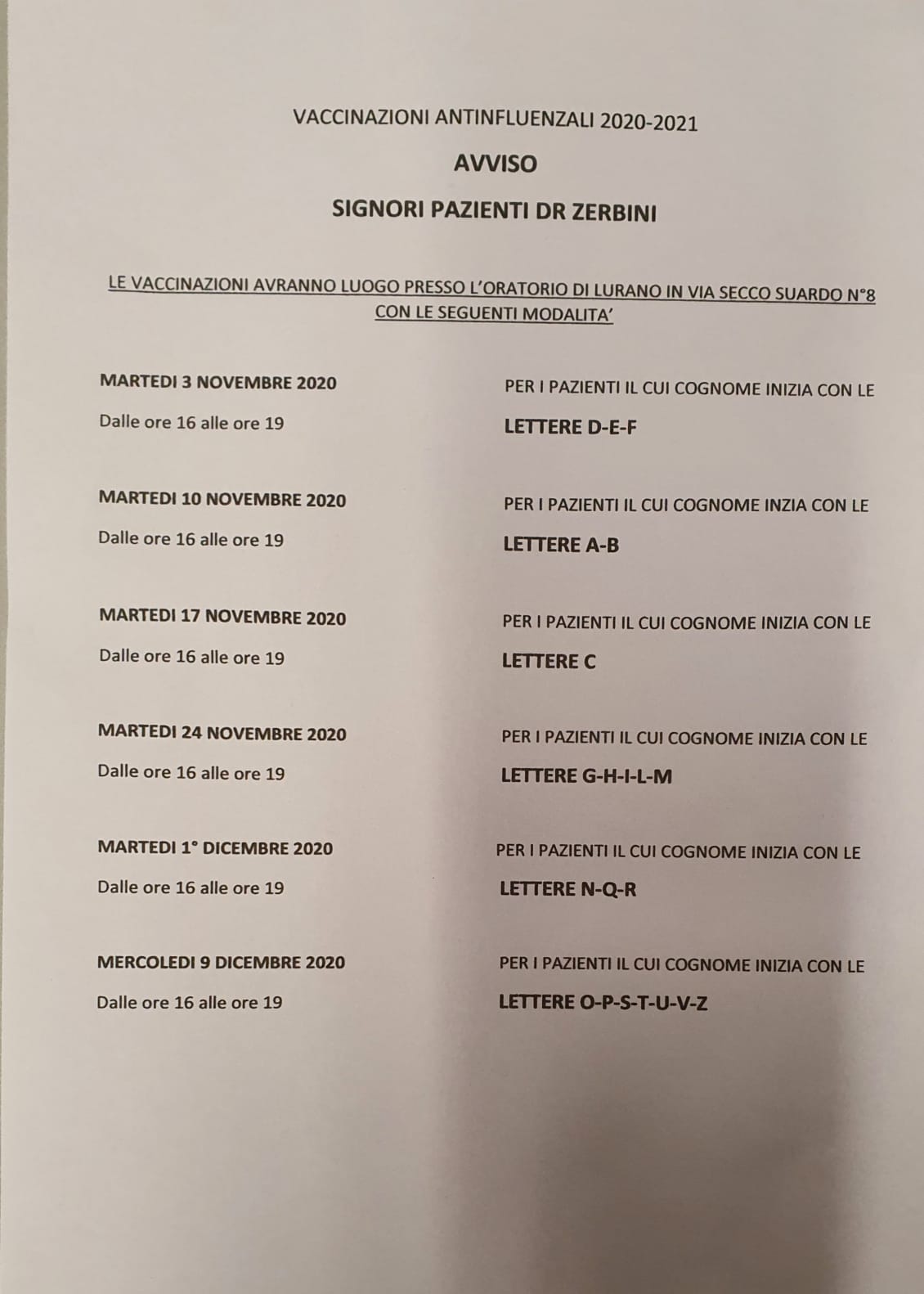 La vaccinazione verrà effettuata presso l'oratorio di Lurano in via Secco Suardo 8, secondo le modalità descritte in Allegato