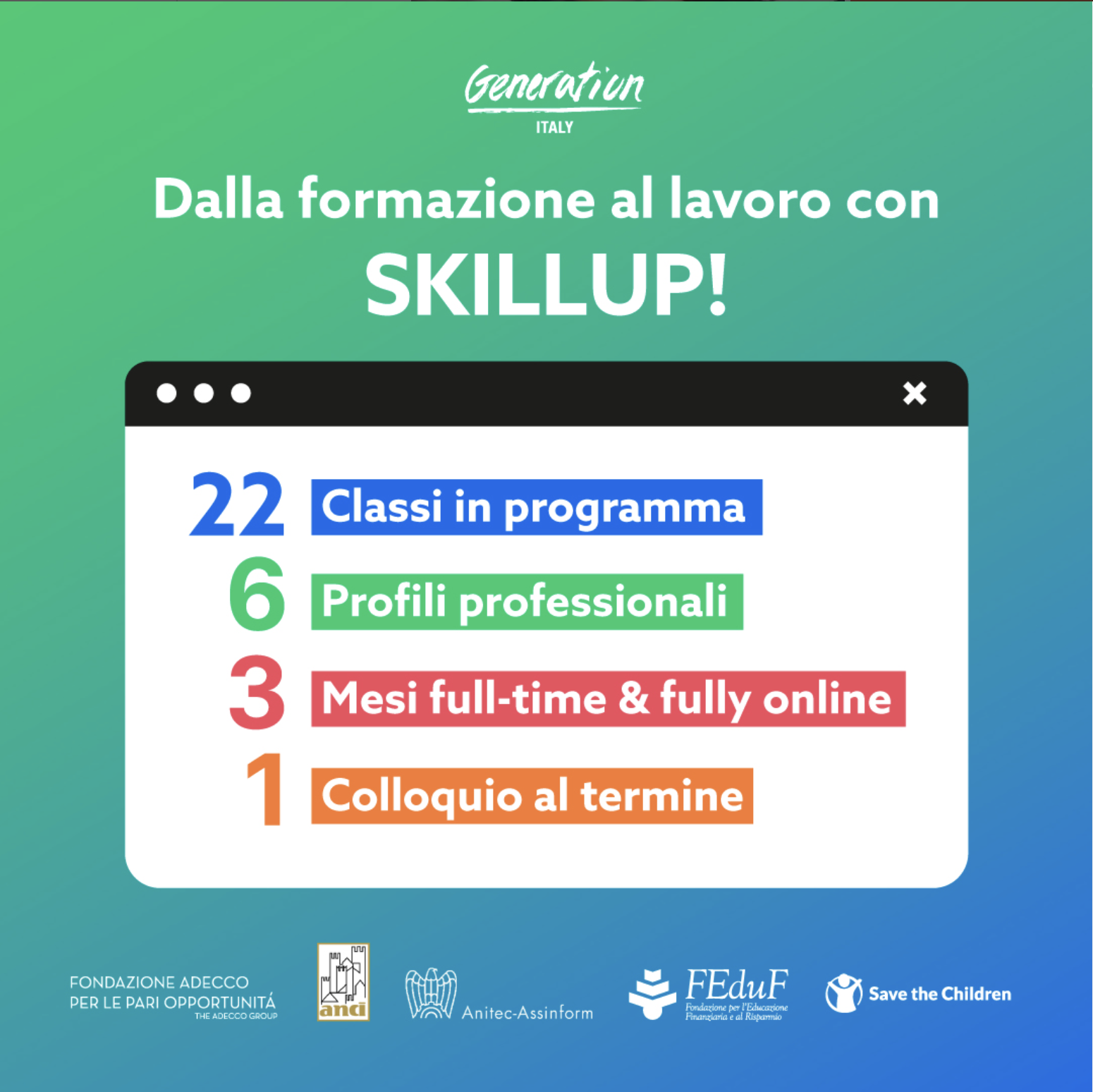 Il progetto si rivolge a giovani di età 18-34 anni che siano disoccupati, inoccupati, sottoccupati e NEET provenienti da tutta Italia, interessati ad avviare una carriera nelle professioni digitali.