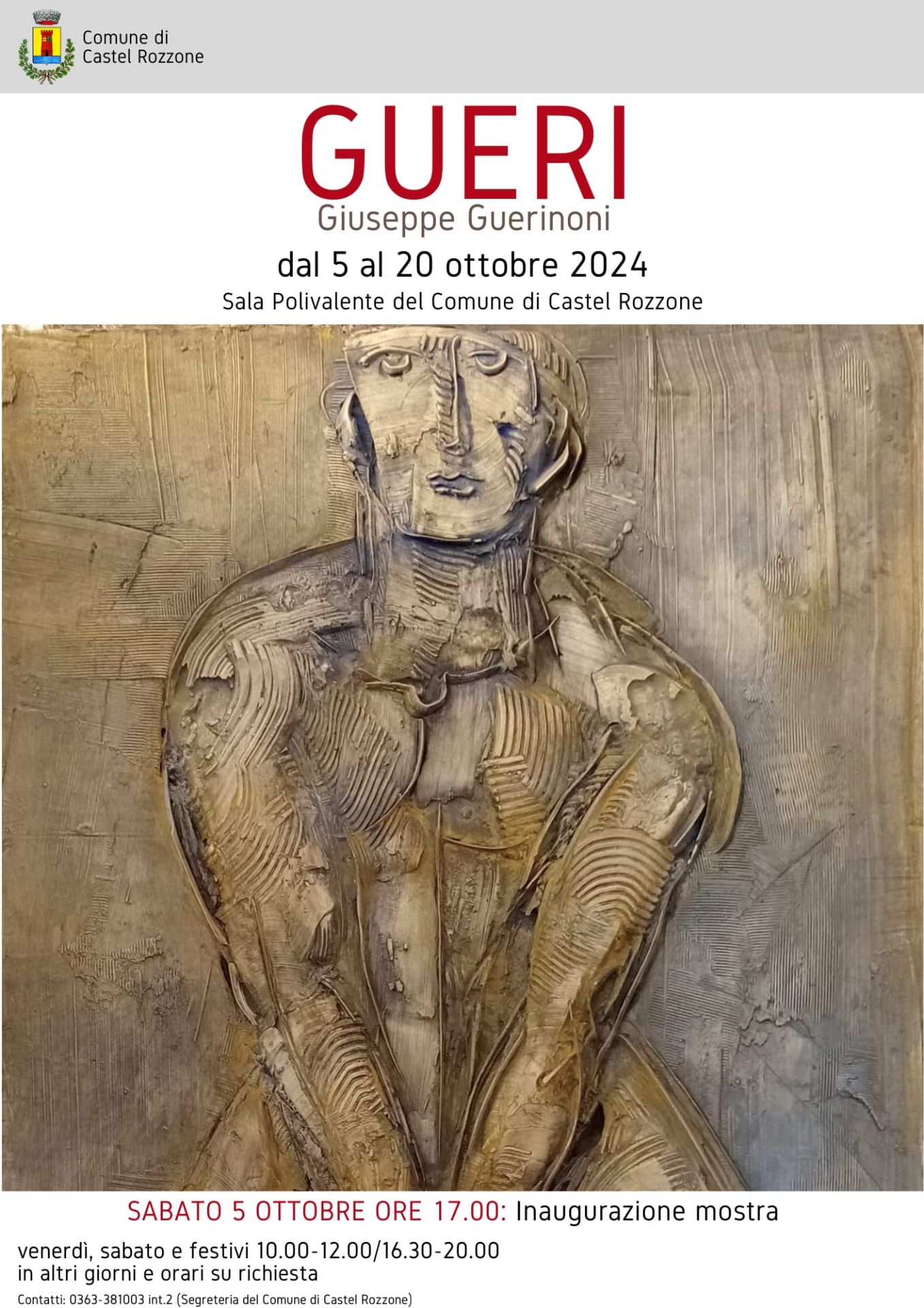 Gueri è un artista poliedrico che esplora la scultura, la pittura e la grafica, con una forte personalità che si esprime attraverso il segno. Esporrà a Castel Rozzone dal 5 al 20 ottobre, nella sala Polivalente. La mostra inaugurerà sabato 5 ottobre alle 17.00 in sala consiliare. Vi aspettiamo!