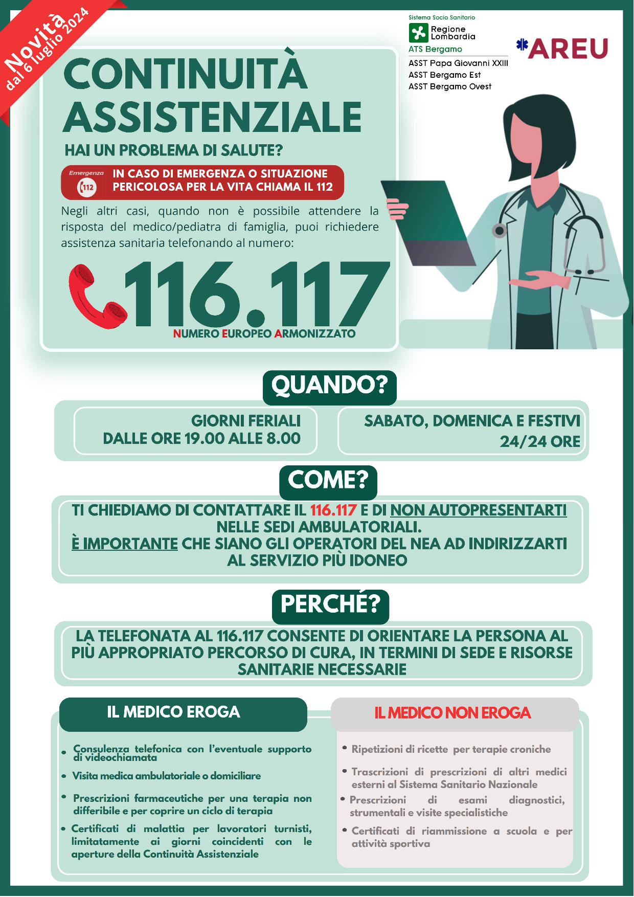 Sabato 6 luglio il territorio bergamasco vedrà l’avvio di un nuovo servizio a favore dei cittadini: la Centrale UNI.CA al n° telefonico 116117 per la gestione della Continuità Assistenziale – CA - (ex guardia medica)