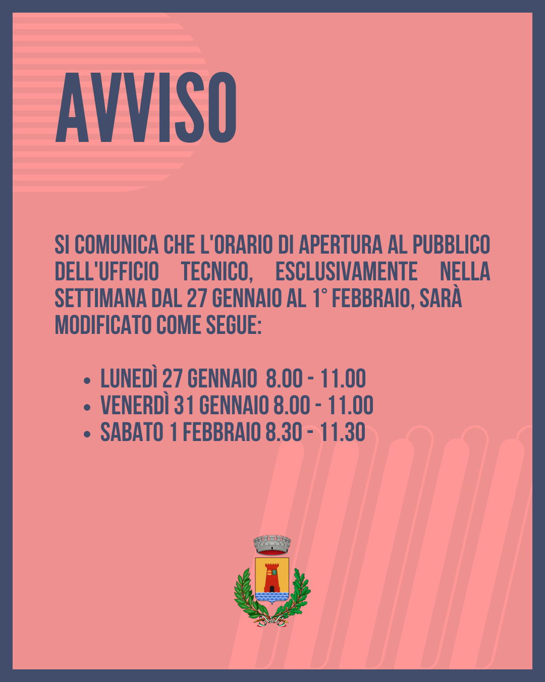 Si comunica che l'orario di apertura al pubblico dell'ufficio tecnico, esclusivamente nella settimana dal 27 gennaio al 1° febbraio, sarà modificato come segue: