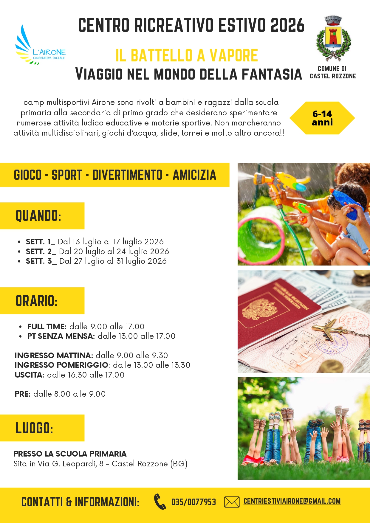 I camp multisportivi Airone sono rivolti a bambini e ragazzi dalla scuola primaria alla secondaria di primo grado che desiderano sperimentare numerose attività ludico educative e motorie sportive. Non mancheranno attività multidisciplinari, giochi d'acqua, sfide, tornei e molto altro ancora!!